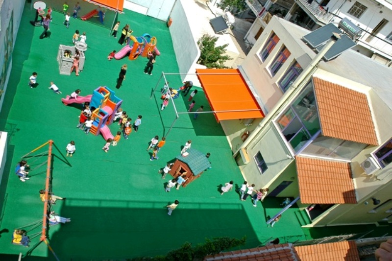 Αυλές μεγάλες με οργανωμένες και ασφαλείς παιδικές χαρές.